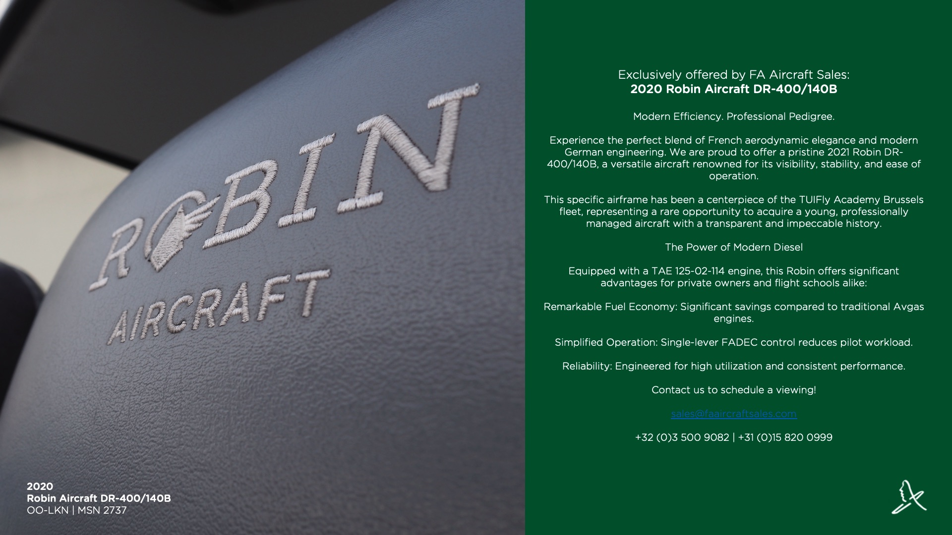 Exclusively offered by FA Aircraft Sales: 2020 Robin Aircraft DR-400/140B