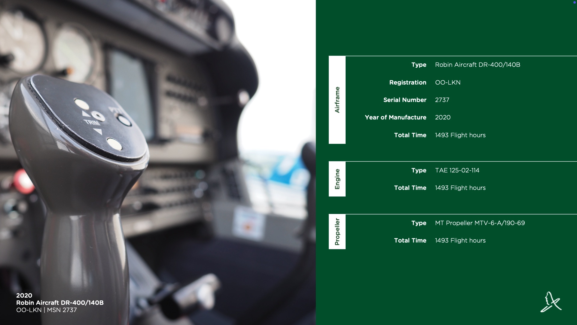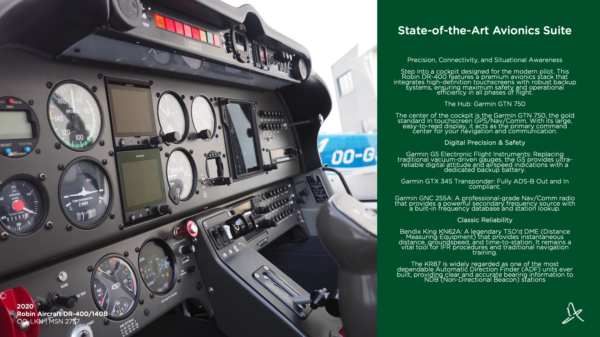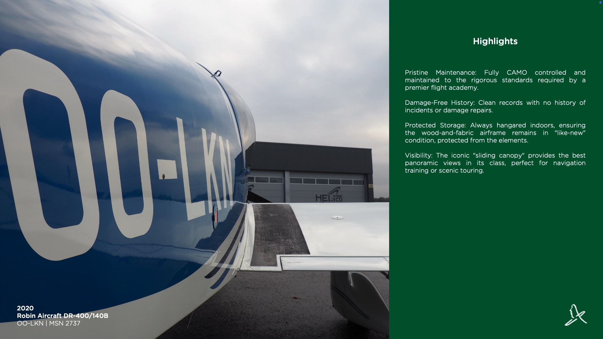 Experience the perfect blend of French aerodynamic elegance and modern German engineering. We are proud to offer a pristine 2020 Robin DR-400/140B, a versatile aircraft renowned for its visibility, stability, and ease of operation.