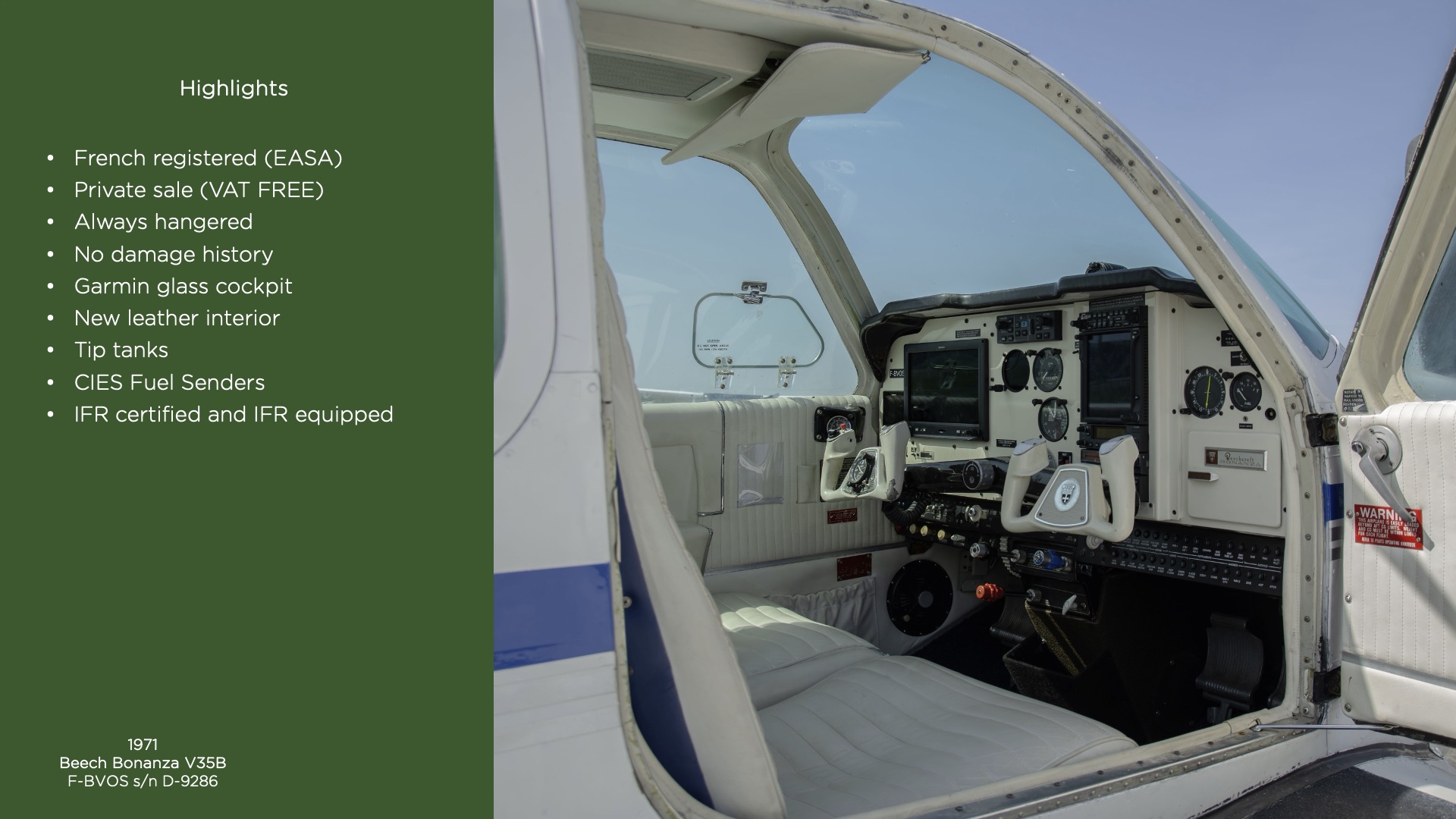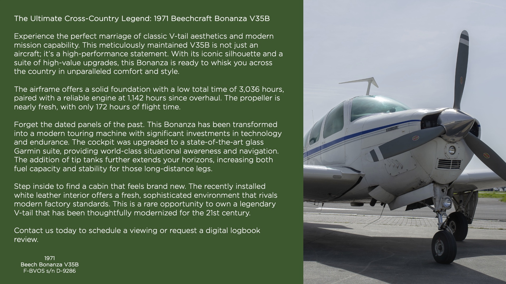 Experience the perfect marriage of classic V-tail aesthetics and modern mission capability. This meticulously maintained V35B is not just an aircraft; it’s a high-performance statement. With its iconic silhouette and a suite of high-value upgrades, this Bonanza is ready to whisk you across the country in unparalleled comfort and style.