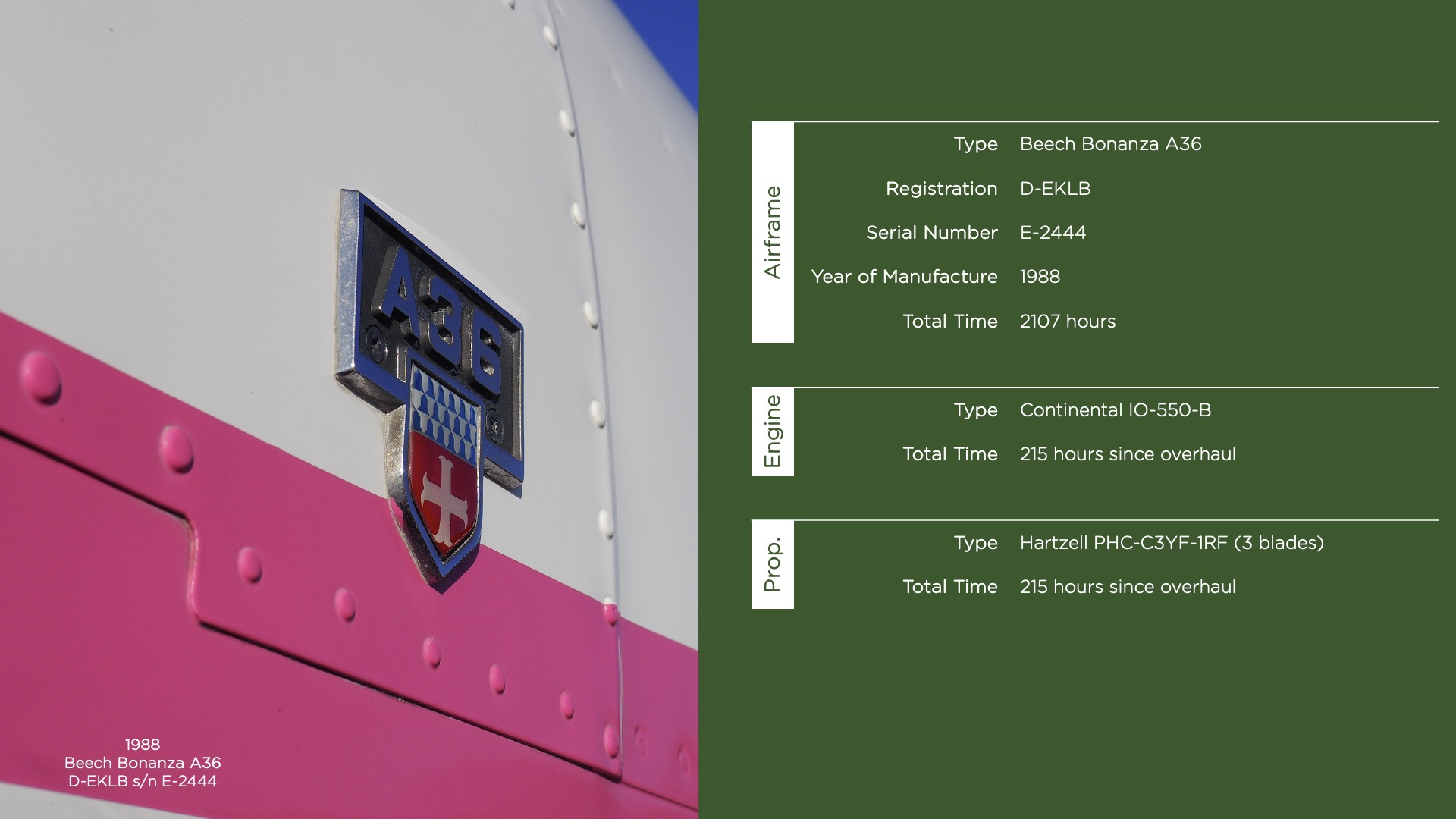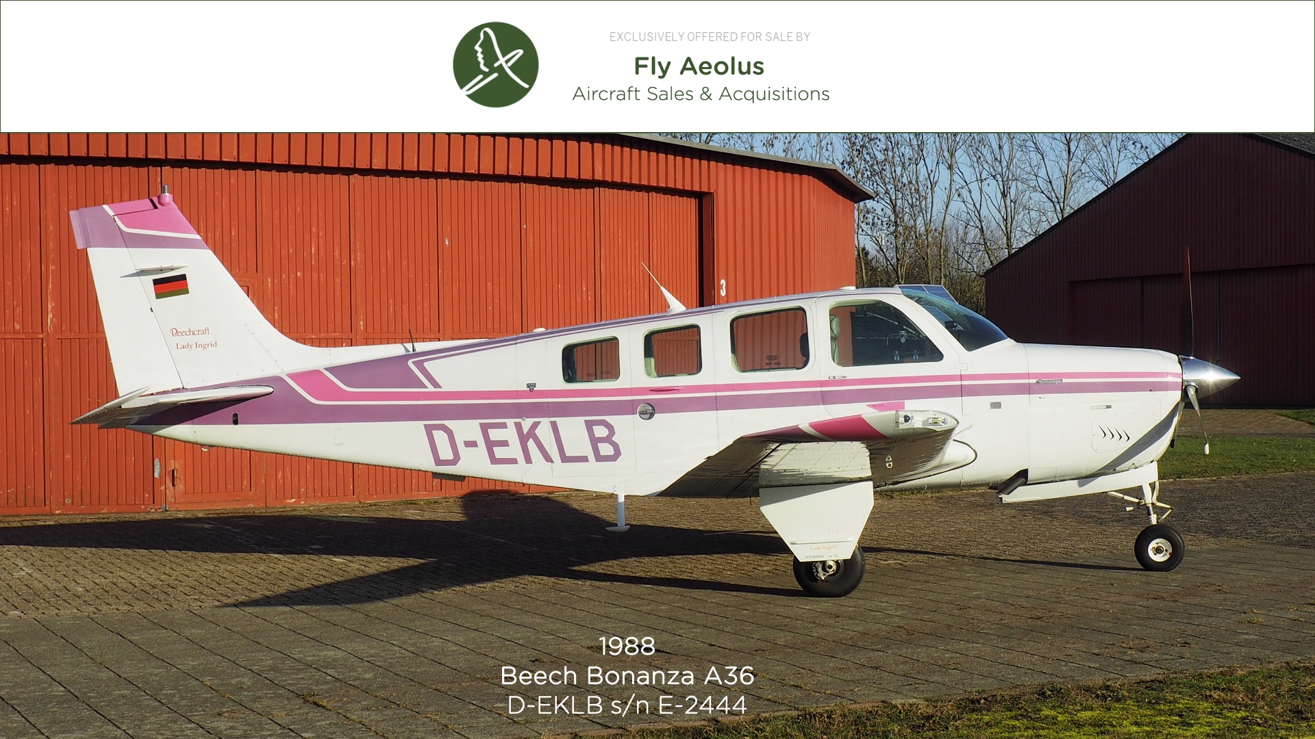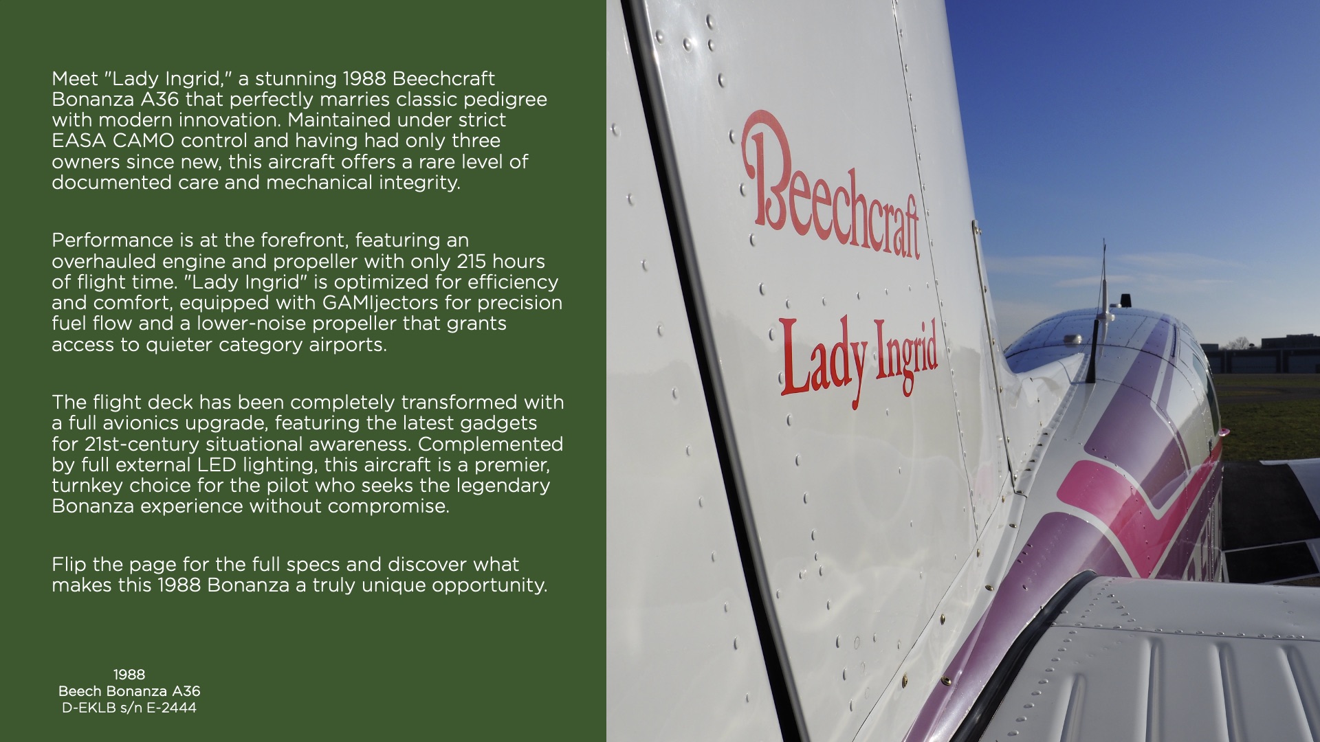Maak kennis met “Lady Ingrid”, een schitterende Beechcraft Bonanza A36 uit 1988 waarin klassieke allure en moderne innovatie perfect samenkomen. Dit toestel is onderhouden onder strikt EASA CAMO-beheer en heeft sinds de levering slechts drie eigenaren gehad. Hierdoor biedt dit vliegtuig een zeldzaam hoog niveau van gedocumenteerd onderhoud en mechanische integriteit.