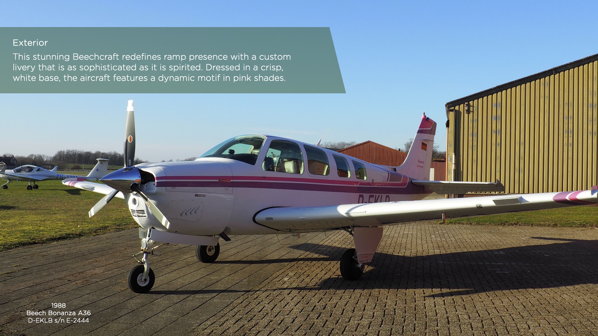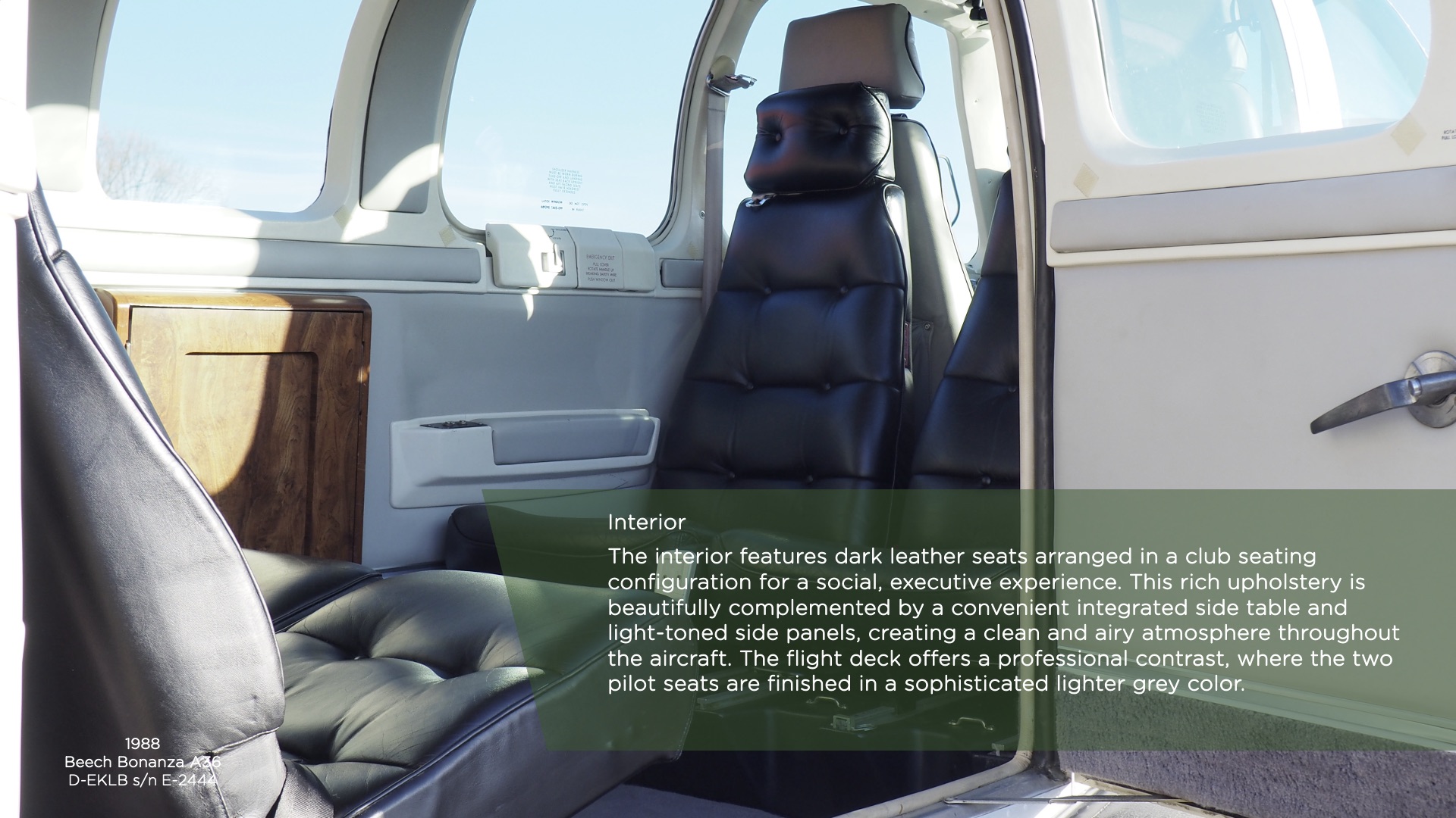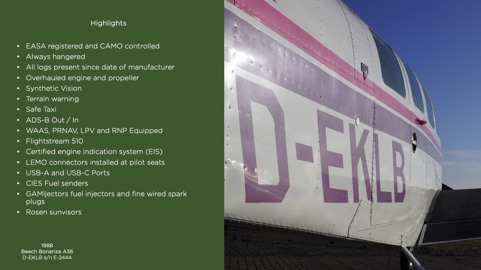 De cockpit is volledig getransformeerd met een complete avionica-upgrade, voorzien van de nieuwste technologieën voor optimaal situationeel bewustzijn in de 21e eeuw. Samen met de volledige externe LED-verlichting is dit toestel een eersteklas ’turnkey’ keuze voor de piloot die op zoek is naar de legendarische Bonanza-ervaring zonder compromissen.